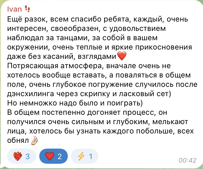Танцоры достигают эйфории за счет собственных эмоций и ощущения единения с другими людьми. Танец служит формой медитации, помогая справиться со стрессом и обрести спокойствие. Когда человек выходит на танцпол, ему предлагается отпустить суждения и ожидания, позволив себе почувствовать эмоции, связь тела, разума и духа.